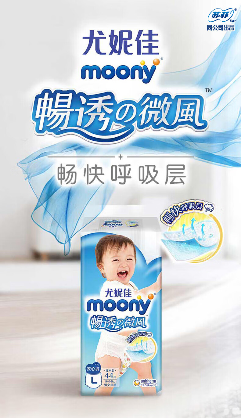 商品名称:MOONY尤妮佳畅透拉拉裤L44片(9-14kg) 经典之选透气柔软(男女通用)